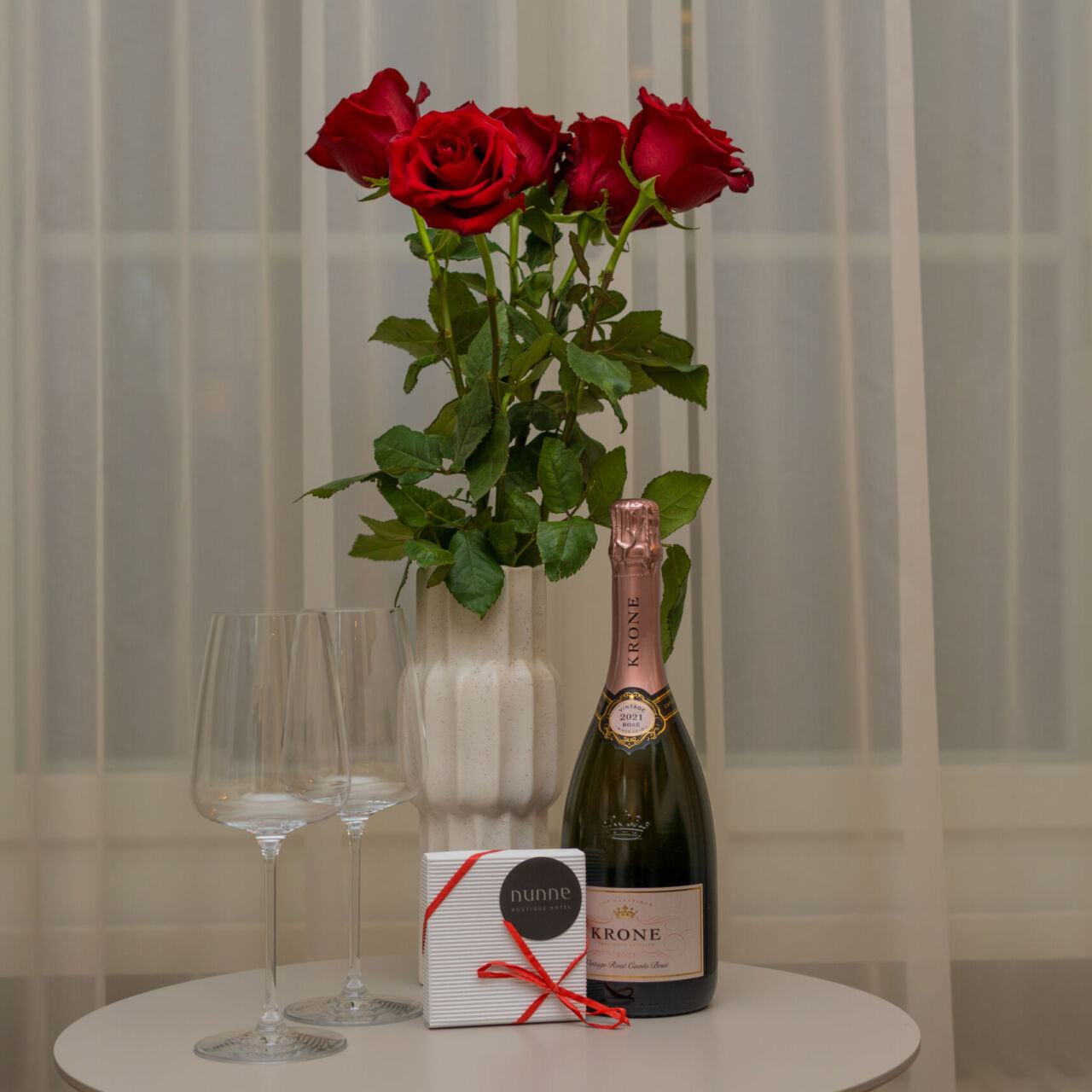 Enjoy a luxurious stay in our Nunne Grand suite, where every detail is catered to your comfort. Champagne, artisanal chocolates and red roses upon your arrival, along with a tasting menu dinner, create a truly memorable experience. Two-hour spa access and late checkout provide additional relaxation and cherished moments together.