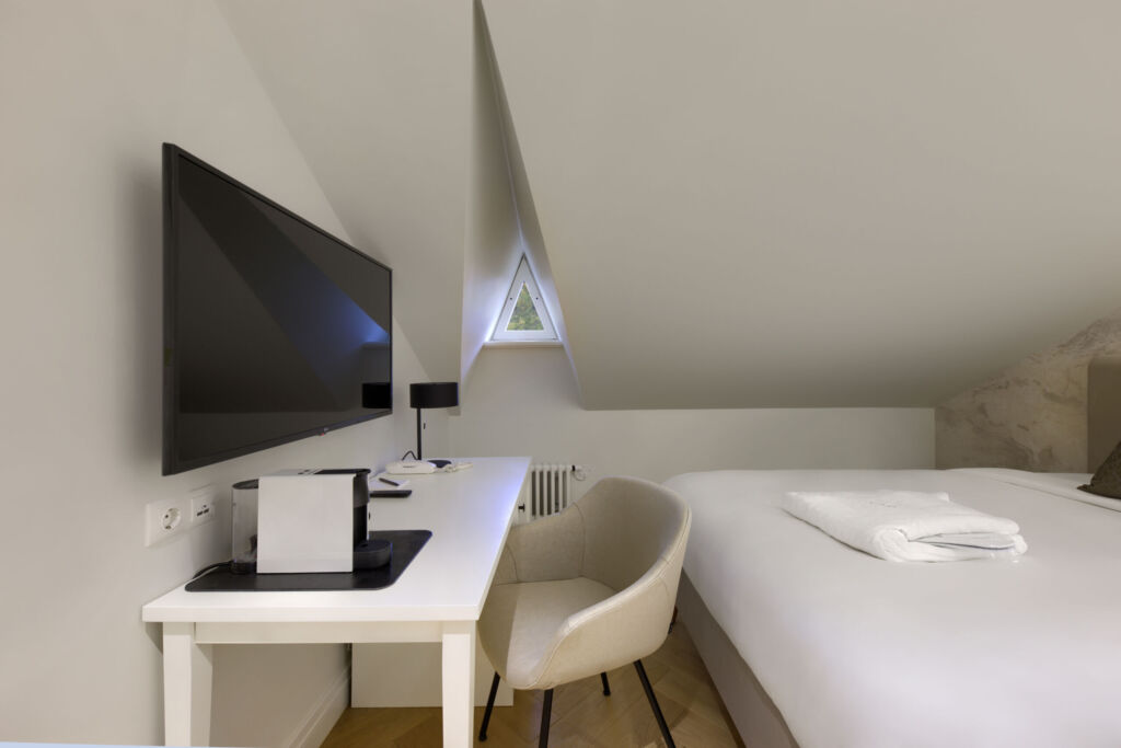 The Attic single room is where history meets modern comfort. Despite having a limited view, this room offers a unique and exciting perspective of the city’s history. Enjoy a cozy and inviting space designed for the comfort of solo travelers. The room features a plush 140 cm wide bed, providing a restful night’s sleep. The room size ranges between 15-18 m².